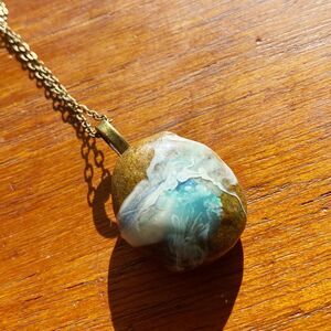 Translucent Teal Epoxy Resin Square Pendant with Natural Mica Mountain with 24 in Stainless Steel Pendant. Pendant measures 1.25 in H by .75 in W.