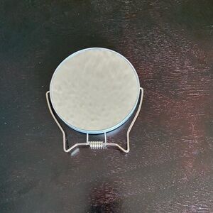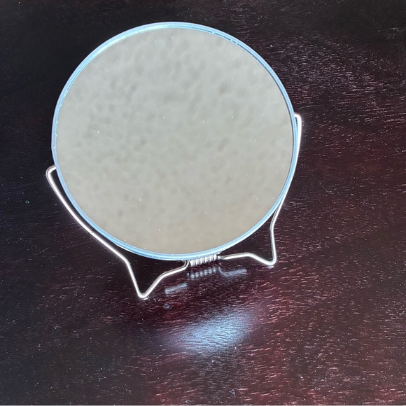 Make up mirror with a silver frame. Perfect for vanity or desk use. One side magnified. 5in.