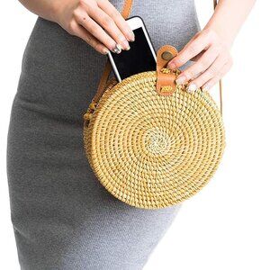 Round Straw Bag Shoulder Leather Straps | Wicker Rattan Hand Woven Crossbody Sho