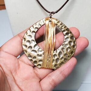 Round Thin Hammered Brass Copper Wire Wrapped Large Pendant 26" Unsigned