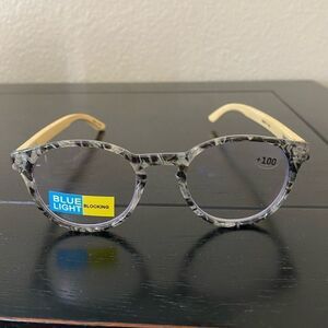 Glasses, Readers, Blue Light Blocking, light weight plastic frames with Bamboo Temples. These are black and clear tortoise shell, the clear seems to pick up a pale purple hue. Fun, stylish, contemporary, trendy