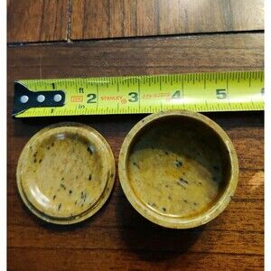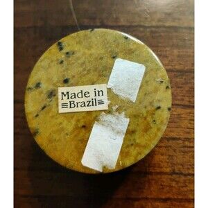 This vintage round trinket jewelry box is made of yellowish brown marble stone, sourced from Brazil. The unique marbled pattern adds a touch of elegance to this decorative collectible. With its sturdy lid and compact size of 2.25 inches in length, it is perfect for storing small trinkets or jewelry pieces in a stylish and vintage manner. Made from high-quality marble and stone materials, this jewelry box is a beautiful addition to any collection or decor.