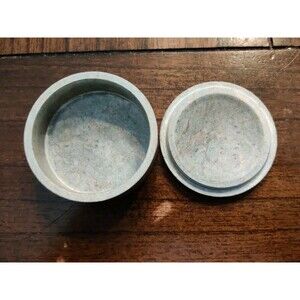 This vintage round trinket jewelry box made in Brazil features a beautiful gray marble stone finish with a marbled pattern. It has a 2.25" diameter and comes with a lid to secure your precious jewelry or keepsakes. The elegant design and craftsmanship make it a unique and stylish addition to any decorative collection. Made with high-quality marble and stone materials, this jewelry box is both functional and visually appealing.