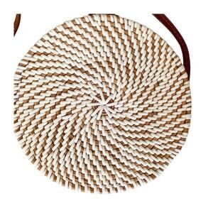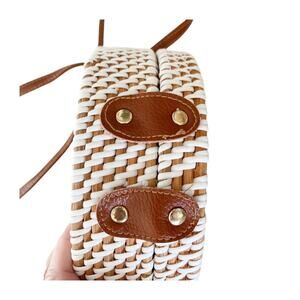 White round rattan crossbody bag has triple pom bag charm. Snap top close. Faux leather strap. Opens up to black lining. Strap drop = 26". NWOT.