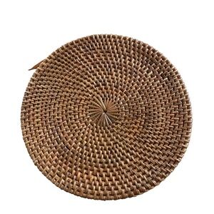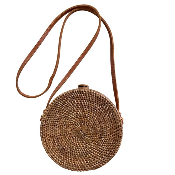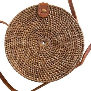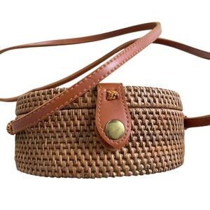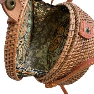 Round Woven Rattan Tan Crossbody Bag Snap Closure Lined