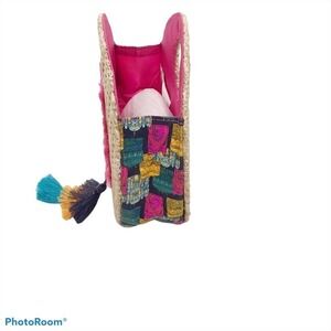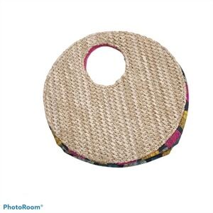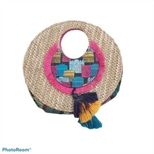 Round basket weave clutch purse. Round cut out for the handle. Attached tassels on the front. Pink fringe around a colorful city building print. Bright pink interior.