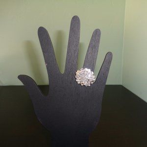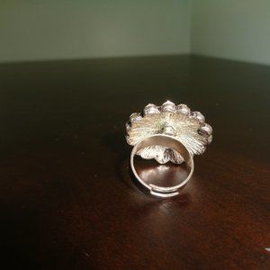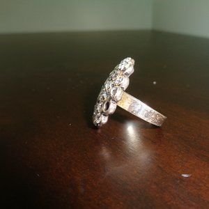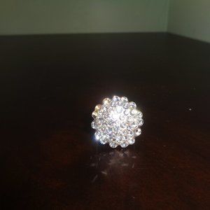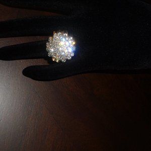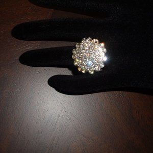Beautiful round faux crystal ring is very sparky and shiny. It's a fair condition: missing a few crystals and shows signs of wear and tarnish. It looks very beautiful on the finger.
