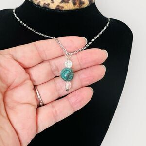 Round turquoise & clear crystal pendant silver wire wrapped plus a 20.” Long stainless steel necklace