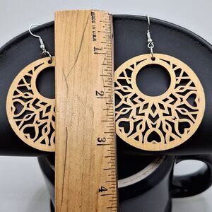 Round wood carved earrings boho jewelry heart design