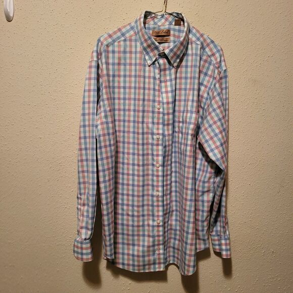 The Roundtree & Yorke Gold Label Men's Shirt in size 16 1/2 features a classic button-down design with a collared neckline and long sleeves. Made from 100% cotton fabric, this shirt is easy to care for with its non-iron and wrinkle-resistant properties. The shirt is suitable for various occasions such as travel, weddings, parties, casual wear, work, and business meetings. The multicolor plaid pattern adds a touch of sophistication to this versatile dress shirt, making it a stylish and practical addition to any man's wardrobe.