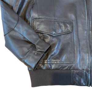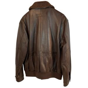This is a fabulous, never worn, lamb skin jacket, reminiscent of WW2 naval aviators jackets. It is a warm chocolate BROWN color. The (polyester) fur collar is detachable. It has lots of great features, and currently sells at Dillards for $495. This a size XL. Please see photos for measurements. Its a great coat!