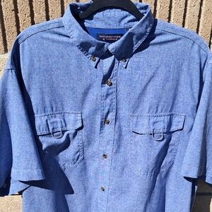 Stylish light blue button-down shirt. Features short sleeves and dual chest pockets. Ideal for casual outings.