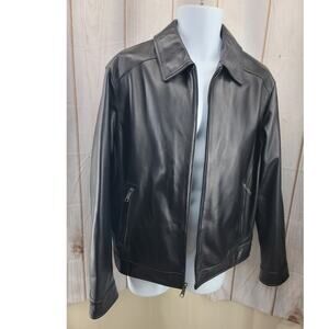 Roundtree & Yorke Men M Black Genuine Lambskin Jacket. Roundtree & Yorke lambskin is carefully hand-selected from the finest leather combining lasting quality and a luxurious feel. Lambskin's natural quality gives it a velvety touch. Jacket features a full satin lining for warmth, 1 zipper and 2 slit interior pockets, zipper front closure, zipper side front pockets with easy to grab hefty metal zipper tabs and double-snap sleeve cuffs. Perfect for those looking for a timeless and well-crafted leather jacket with a touch of retro charm. Excellent like new condition.
