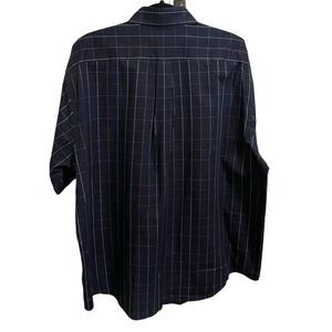 This is a pre-owned men dress shirt by Roundtree & Yorke, size 3XL. It features a red and blue check pattern with a collared neckline and button-down closure. The shirt has short sleeves and a classic fit, with a shirt length of 31 inches and a chest size of 26 inches. It also has a front pocket and is made of a woven blend of polyester and cotton. The shirt is machine washable and was made in Indonesia.