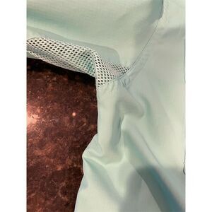 Elevate your casual summer wardrobe with this Roundtree & Yorke button-up shirt in a refreshing light green. Designed for comfort, its lightweight polyester fabric and breathable mesh-lined underarms ensure you stay cool and relaxed. The collared neckline and button closure offer a classic look, while the convenient chest pocket adds a touch of practicality. Perfect for casual outings, weekend get-togethers, or a laid-back day at the office. This pre-owned shirt in size L is in excellent condition, ready to become a staple in your collection.