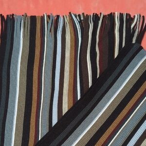 Stylish scarf with multicolor stripes and fringe detail. Perfect for adding a pop of color to any outfit. 65 inches in length
