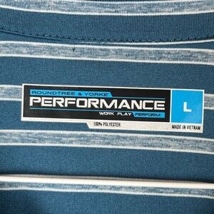 Roundtree & Yorke Performance Blue Striped Short Sleeve Polo; Size L; In excellent condition without tears, stains, or holes; 23” pit to pit and 30” collar to hem; Fabric and care instructions shown in pictures