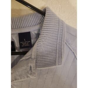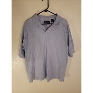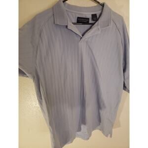 Step up your style with this modern Roundtree & Yorke polo shirt. Crafted from 100% cotton, this pullover shirt features a collared neckline and short sleeves, making it perfect for casual occasions such as walking, school, or golf. The shirt is a size L with a chest size of 41 inches and a shirt length of 27.5 inches. Its solid blue color and medium fabric wash give it a sleek and polished look that will elevate any outfit.