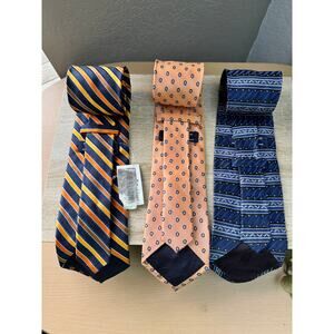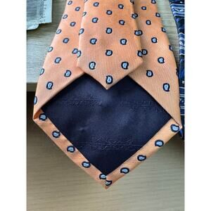 - Navy, Orange, and Gold Stripe: A bold diagonal stripe pattern in navy, orange, gold, and white. This tie is new with the original tag attached.