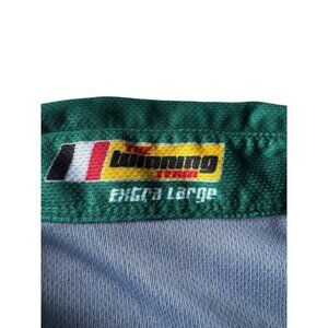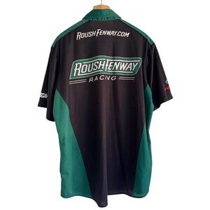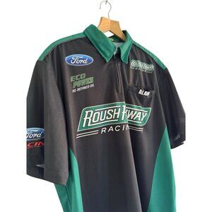 Vintage Roush Fenway Racing Ford men's pullover shirt. Shirt is black and green and says "Roush Fenway Racing," "Ford," "Eco-Power Re-Refined Oil,” “NASCAR” on the sleeve, and has the name "Alan" on the front. The shirt has a 1/4 zip up front and a snap down collar. On the back it also says "Roush Fenway Racing." Shirt is made of 100% polyester and is a man's size XL.