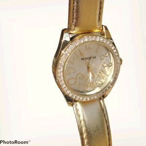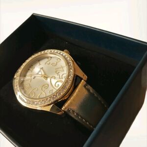 This wonderfully wacky watch is gold-toned stainless steel and leather. The bezel is surrounded by 50 Swarovski crystals. The face is a light gold-tone. The numbers are gold-tone. The hands are luminescent. Quartz movement. Push/Pull crown. Water-resistant up to 30 meters.