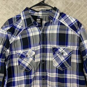 Route 66 Mens Medium Button Up Shirt Blue Plaid Pearl Snap Long Sleeve Western