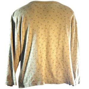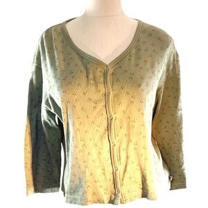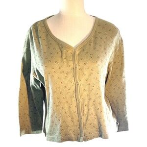 Super cute snap front cardigan in a gorgeous olive color with a small floral rose design in peach and blue. This cardigan is in excellent used condition. Size is XL