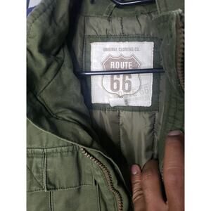 The Route 66 Renegade 7 Heavy Duty Jacket in size Large (10/12) is a stylish and functional winter jacket for teens. Made with a durable cotton outer shell in a solid green color, this mid-length jacket features a military-style design with a pointed collar and a regular fit. The jacket is machine washable and lined with cozy polyester insulation, making it perfect for colder weather activities such as riding. With its vintage look and quality construction, this Route 66 jacket is a practical and fashionable choice for casual occasions. Not alot of wear awesome little jacket cool to add to your attire! Beautiful!