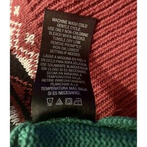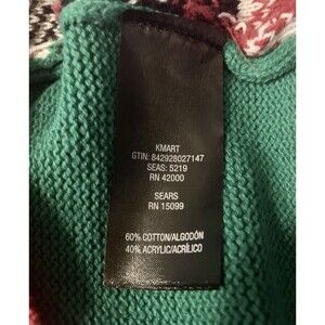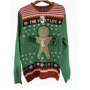 In addition to being ideal for the holiday season, this green and red sweater is also suitable for outdoor activities and has an 80s and 90s vibe. The collarless design adds a touch of uniqueness, and the sweater is available in men's size large. Don't miss out on this Christmas sweater that will make you stand out.