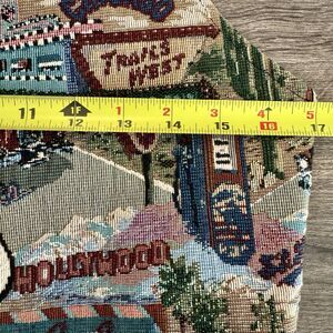 Vintage tapestry vest featuring a bold Route 66 and Americana travel motif. Depicts classic road trip imagery like vintage cars, motel signs, and landmarks such as Chicago and Hollywood.