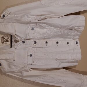 Stylish and durable, this Route 66 white denim jacket is perfect for any occasion. Crafted for comfort and style, it's a must-have for your wardrobe.