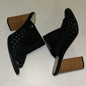 Elegant black clogs with studded design. Comfortable and stylish for any event. Shoe has stripped interior