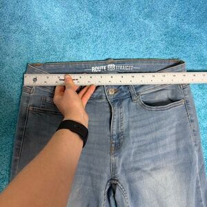 These Route 66 straight-leg jeans are tagged size 10 and best fit a 30" waist and 27" inseam. Classic mid-rise fit (rise: 9"). Light blue wash with minimal wear. Great for casual, everyday style with a touch of Y2K flair.