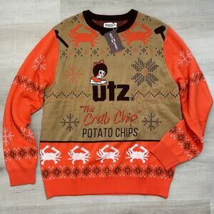 -Features: new with tag, knit sweater, with the Utz crap chips bag design, "Ugly sweater" style with snowflakes on the sleeves and crabs and crab knockers.