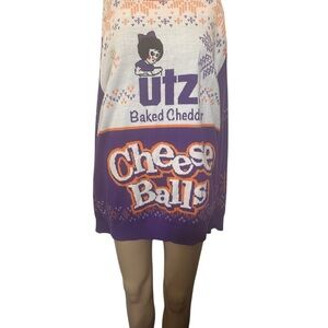 Fun and vibrant unique ugly Christmas sweater featuring playful orange and purple colors. Perfect for casual outings.