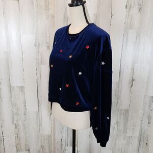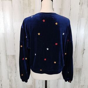 ~ Description: Navy blue velour, red, yellow and gray embroidered stars, long sleeves, midi fit