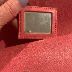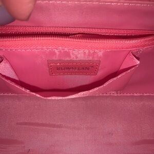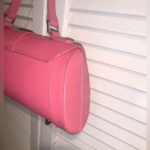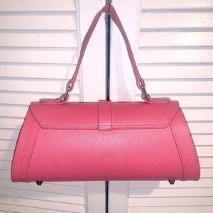 This Rowallan shoulder bag in a striking pink hue is offering both style and durability. The elongated rectangular design features a secure flap closure and elegant metal accents, making it a chic accessory for any occasion.