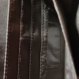 Easy-to-Clean nylon with leather trim exterior with nylon lining. Hardware is silver tone. Shoulder strap is adjustable & removable ~27.5" to ~50" crossbody strap. Front side has the ROWALLAN leather logo on the closure flap while the reverse side has a leather trimmed Identification window holder on a zippered compartment extending almost the entire width of the purse. Opening the snap closure flap reveals a slip-in compartment on the outside, pen holder, and 2 roomy interior compartments. The back compartment has large slip-in pouch, 6 card slots, and another ID plastic window holder. The front compartment contains one large slip-in pouch and another large zippered pocket. All zippers have the Rowallan signature leather logo.