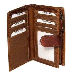 Bifold multi-compartment leather wallet with leather snap tab and zipper closure