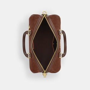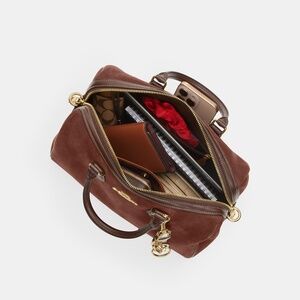 Suede and smooth calf leather Inside snap and zip pockets Zip closure fabric lining Handle with 4 1/2 drop Outside zip pocket Detachable strap with 20 drop for shoulder or crossbody wear 11 3/4 (L) x 8 1/4 (H) x 7 (W) Style No. CCC79