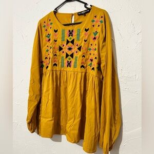 Rowdy Crowd Guadalupe Embroidered Mustard Yellow Aztec Print Blouse Sz XL