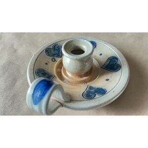 Charming 1987 Rowe Pottery Works chamber candle holder featuring blue hearts and a salt-glazed finish. Hand-thrown with artist's moon stamp on the base. Heavyweight stoneware with handle and natural glaze variations. Measures approx. 7.5" wide and 3" tall. No chips or cracks; one small glaze bubble has missing finish (see photos). Perfect for cottagecore, countrycore, or Valentine's decor.