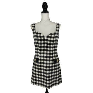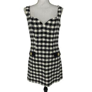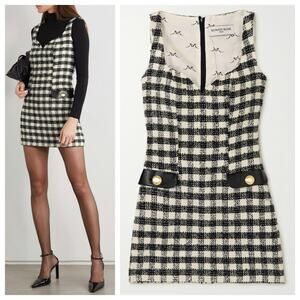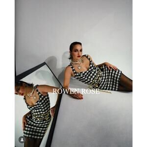 An iconic silhouette from luxury label Rowen Rose, this houndstooth mini dress features striking black and white tweed enhanced by sleek faux leather trim for a modern edge. Expertly crafted in Italy, this structured design flatters the figure with a tailored fit and classic check pattern. The faux leather detailing adds contrast and polish, while the two flap pockets adorned with gold-tone buttons offer signature Rowen Rose sophistication. Perfect for polished daywear or chic evenings out, this dress delivers timeless appeal with a bold twist. Fully lined for comfort.