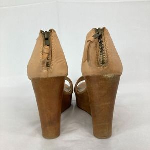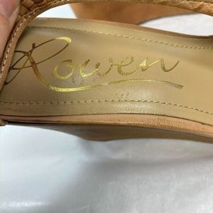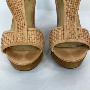 Rowen Sandals Womens Sz 10 Beige Woven Leather Wooden Wedge Heel T Strap Zip