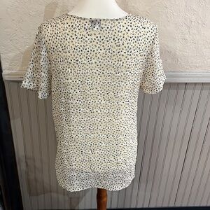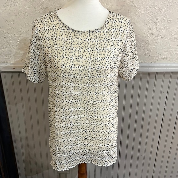 Rowena Blouse Sheer Beige Navy Mini Flowers Slit sides Shirt Sleeve Approx Armpit to armpit 19” Length 26.5”