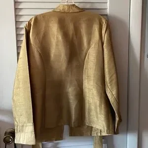 Roxana wrap style lightweight coat. Size 12. This coat can be very dressy and is suitable for formal events. It can also dress up a pair of jeans. There is no fabric information. Is it a beautiful shiny greenish gold color. Tie belt. No buttons or pockets. Like new condition.