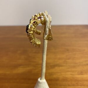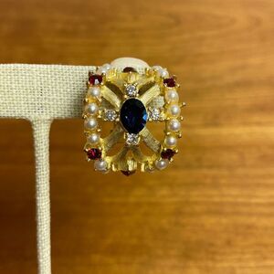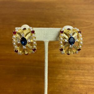 Roxanne Assoulin Gold Tone Faux Pearl Red & Blue Rhinestone Clip On Earrings