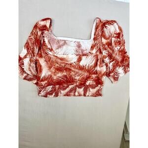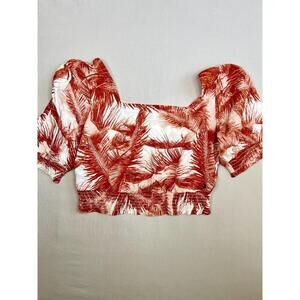 Roxy Short Puff Sleeves Square Neckline Red and white tropical print Crop Top Lg