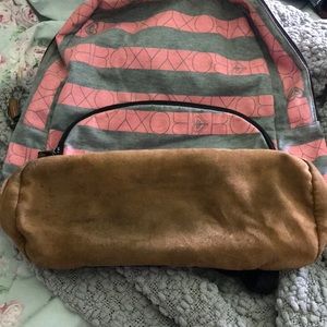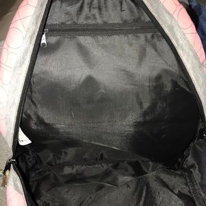 Good condition. All zippers work. Minor stains on the bottom of the backpack. The bottom is a soft material. Minor rip w/ little tag on the shoulder strap. The inside of the bag is clean.