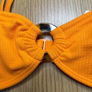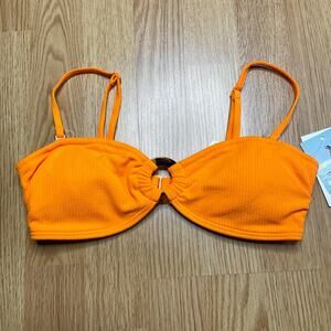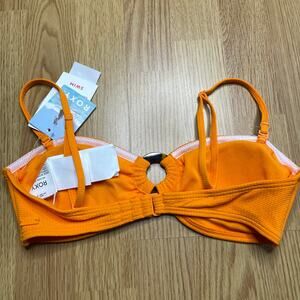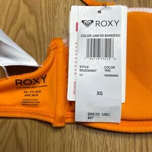 New with tags tangerine Color Jam SD Bandeau bikini top from Roxy, size XS. Bandeau style top with center ring, adjustable spaghetti straps, clasp back, and reinforcement on the sides to prevent rolling. Bright and fun top perfect for the beach or pool.